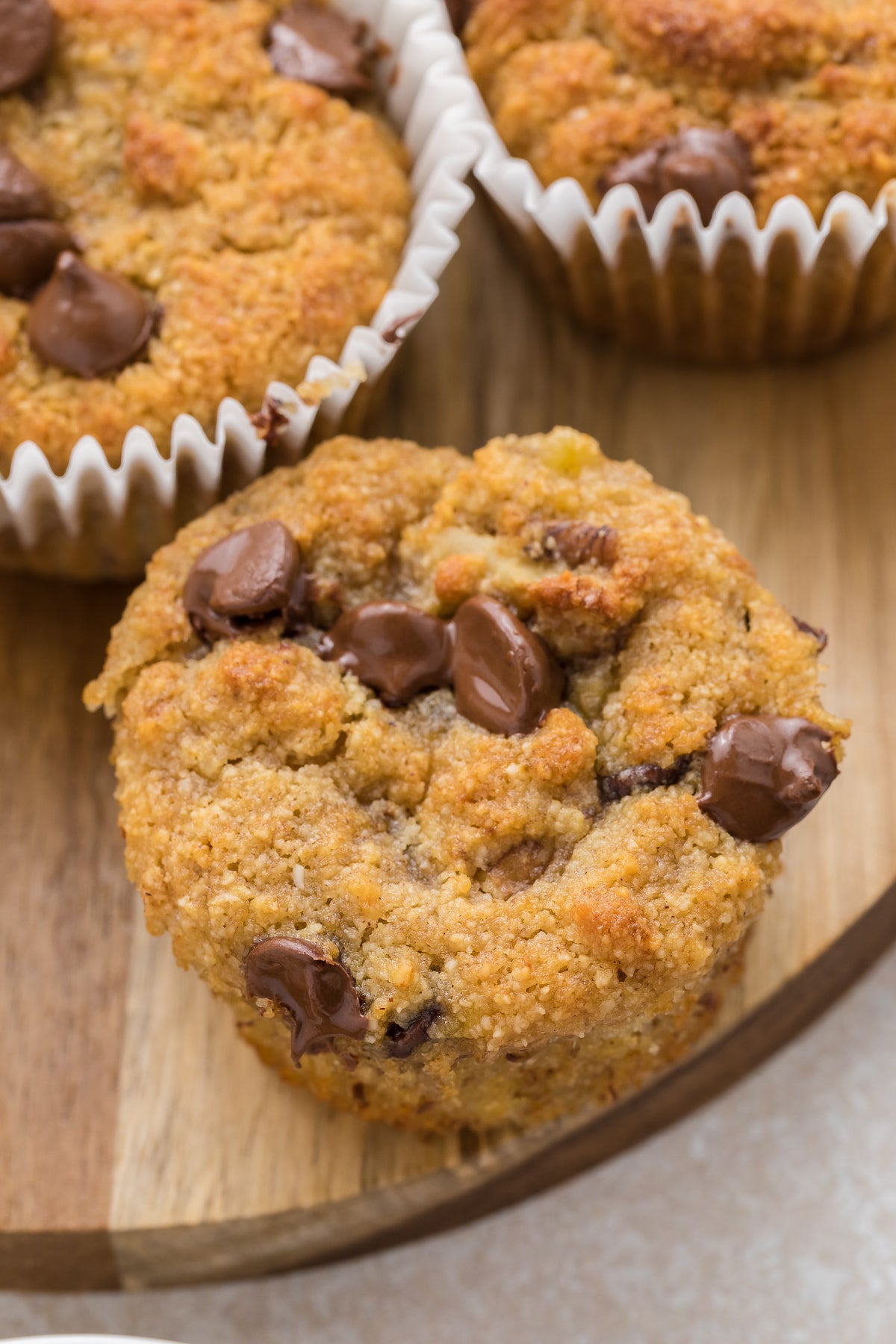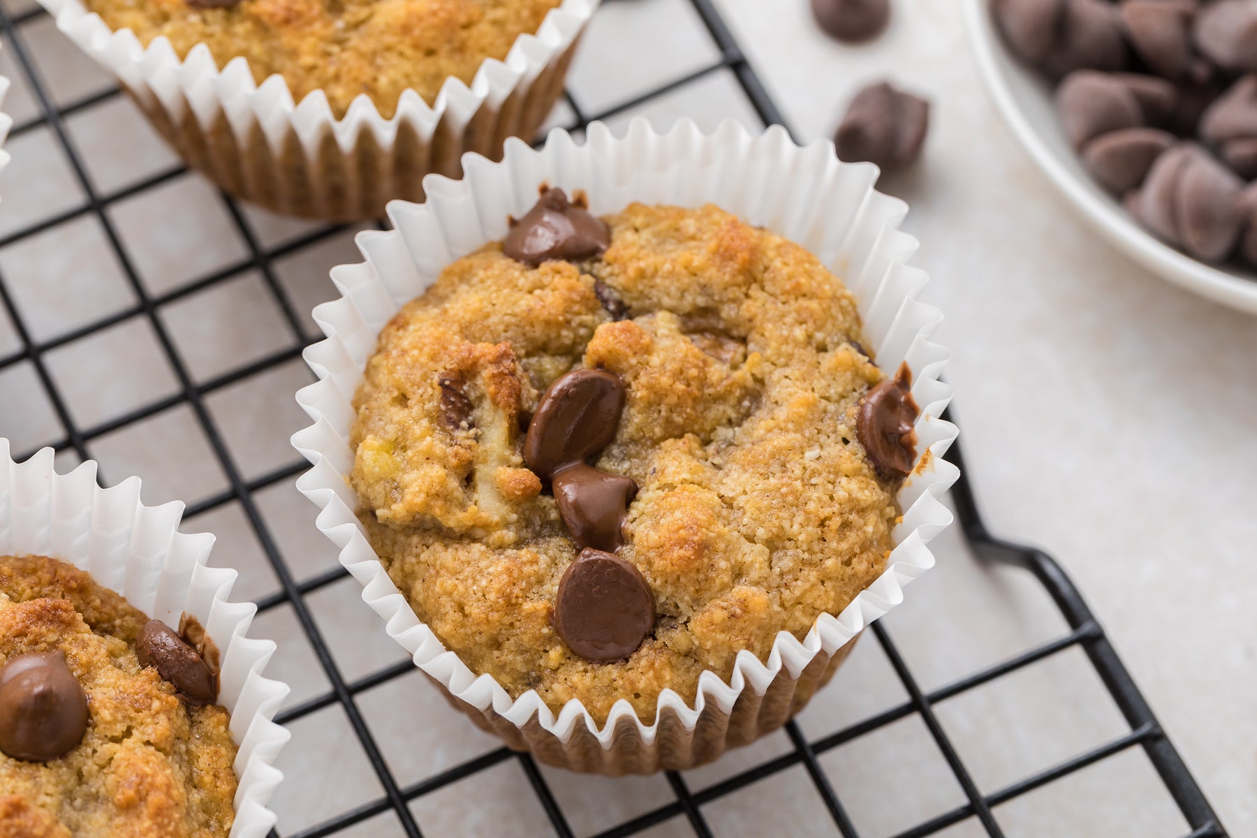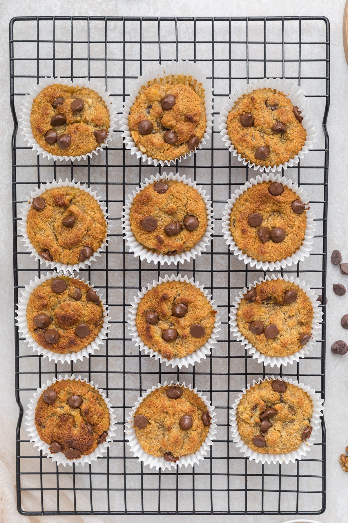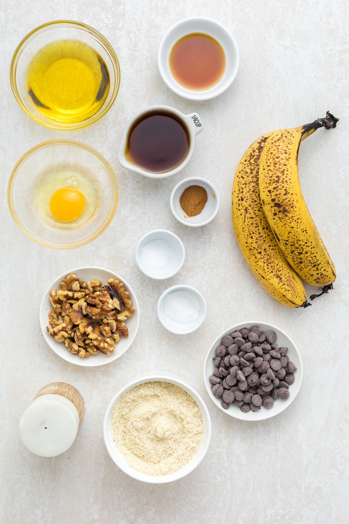 Ingredients: Almond flour, baking powder, baking soda, ground cinnamon, salt, bananas, maple syrup, oil, egg, vanilla extract, walnuts, chocolate chips.