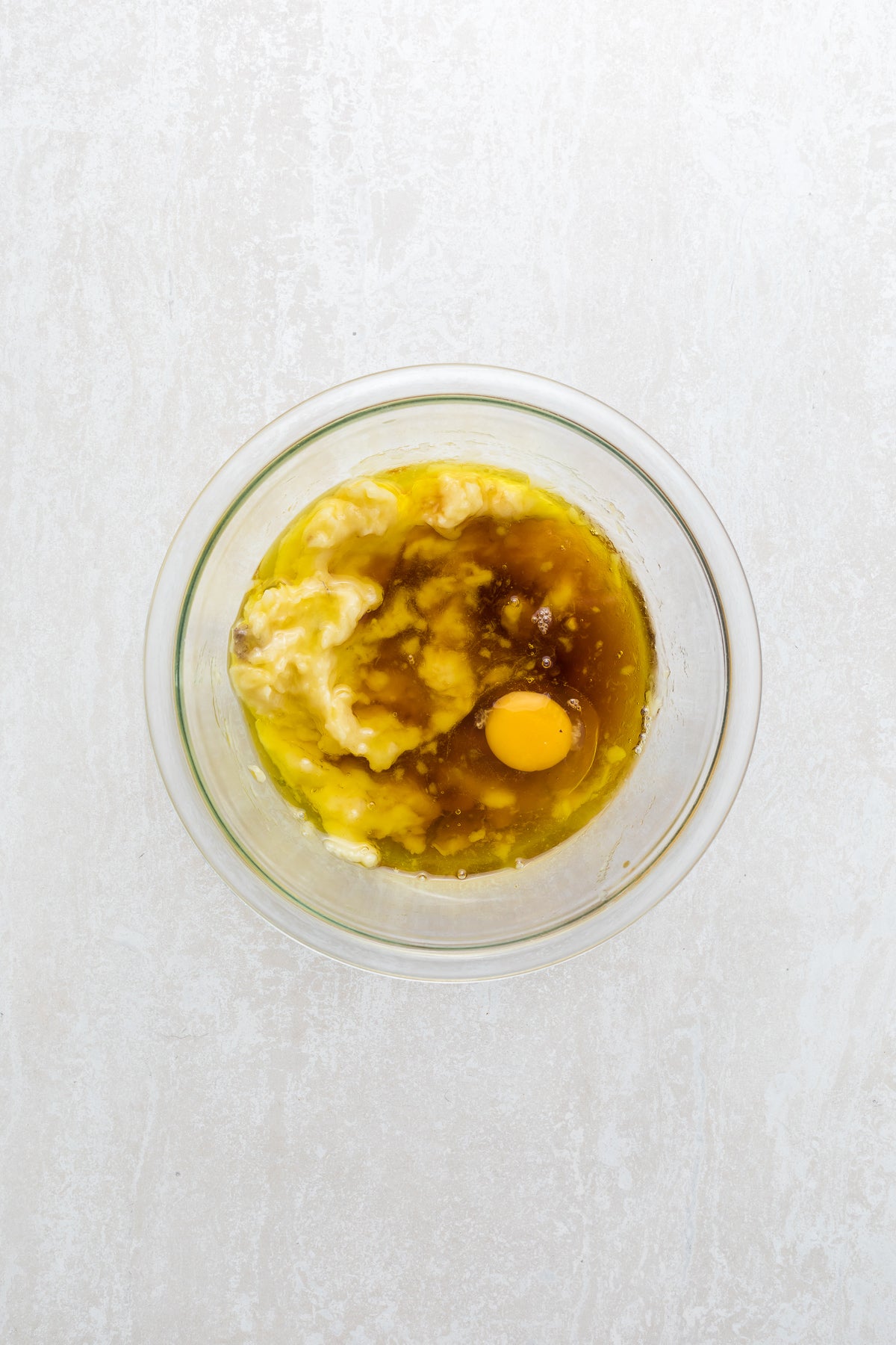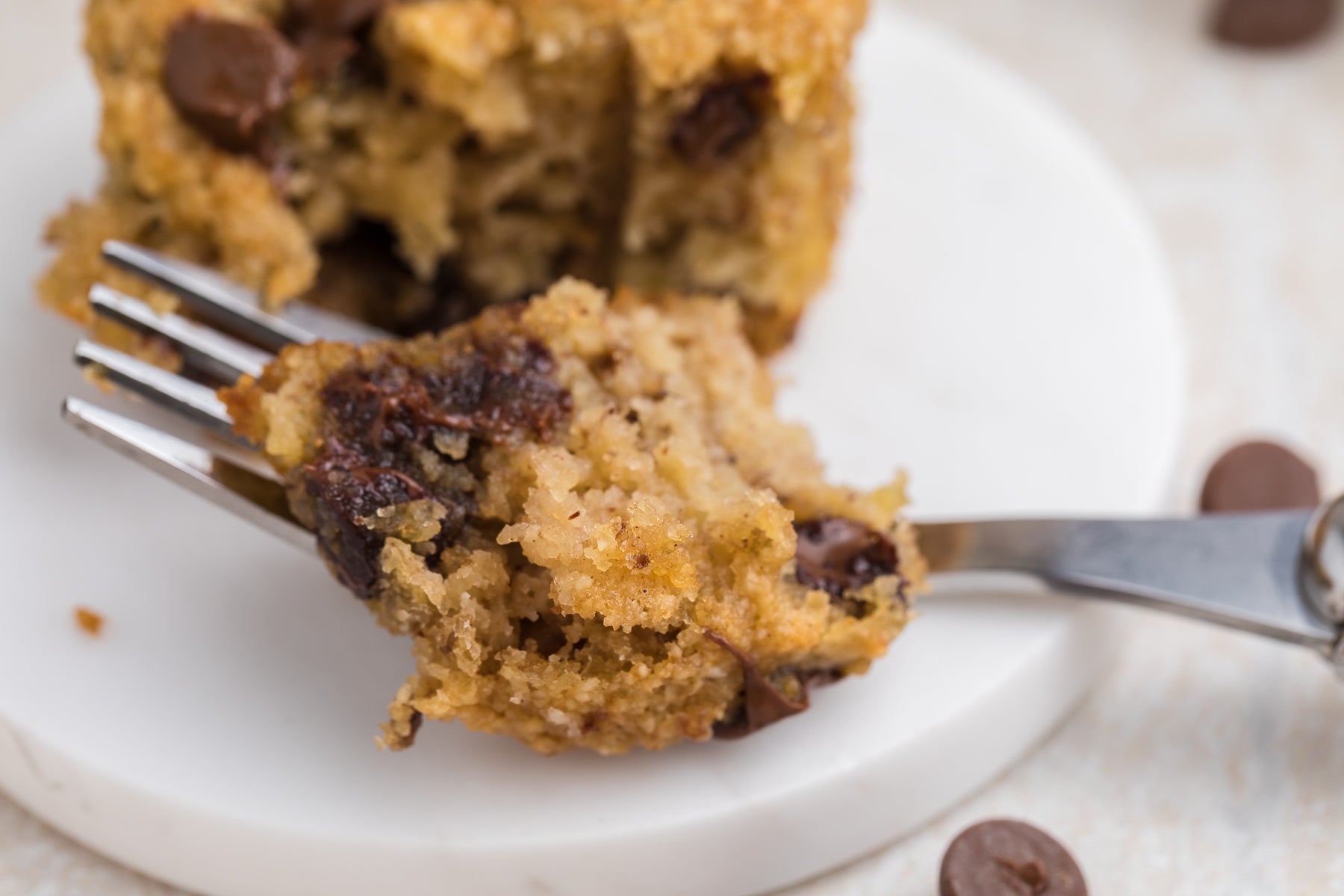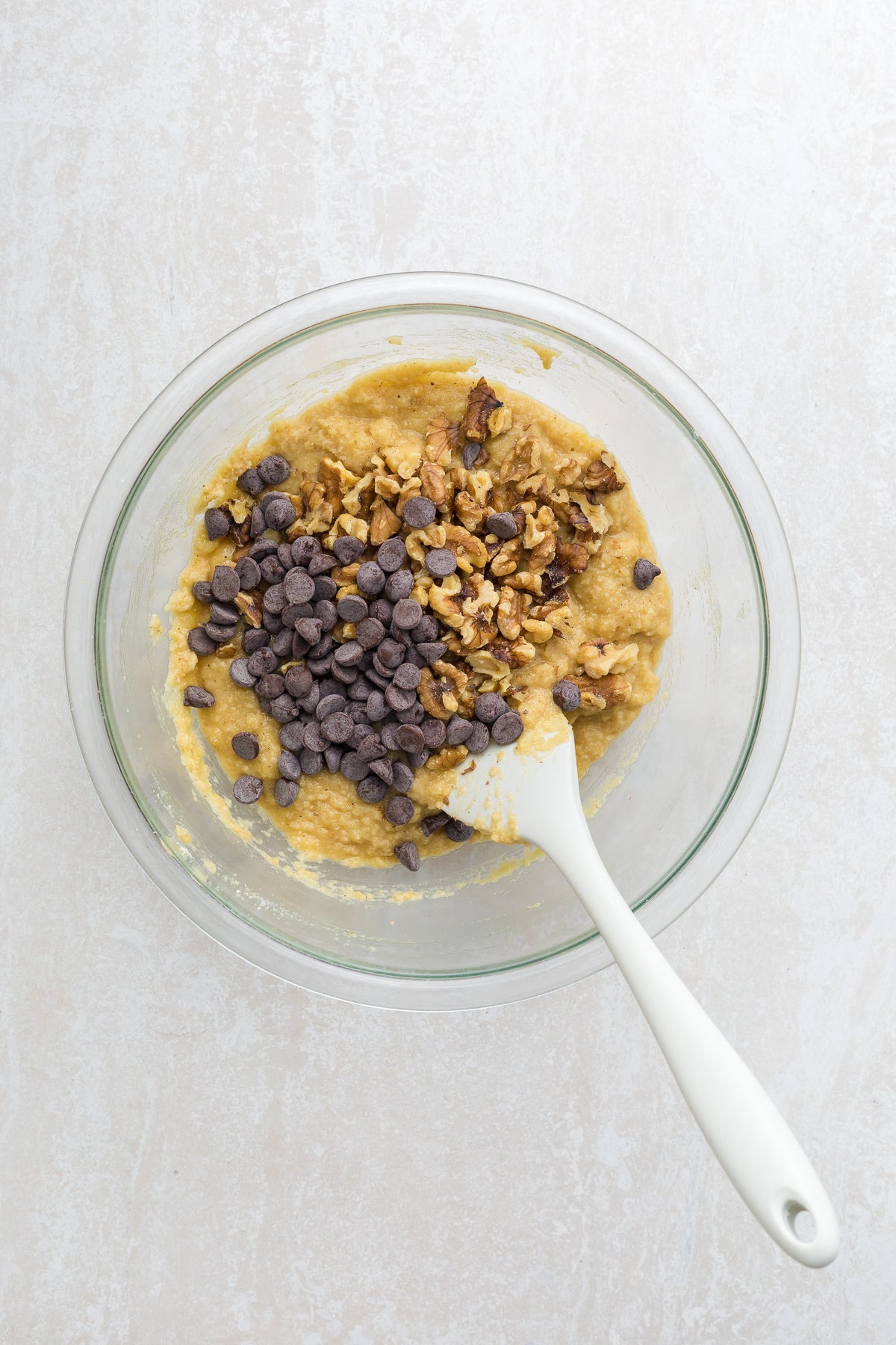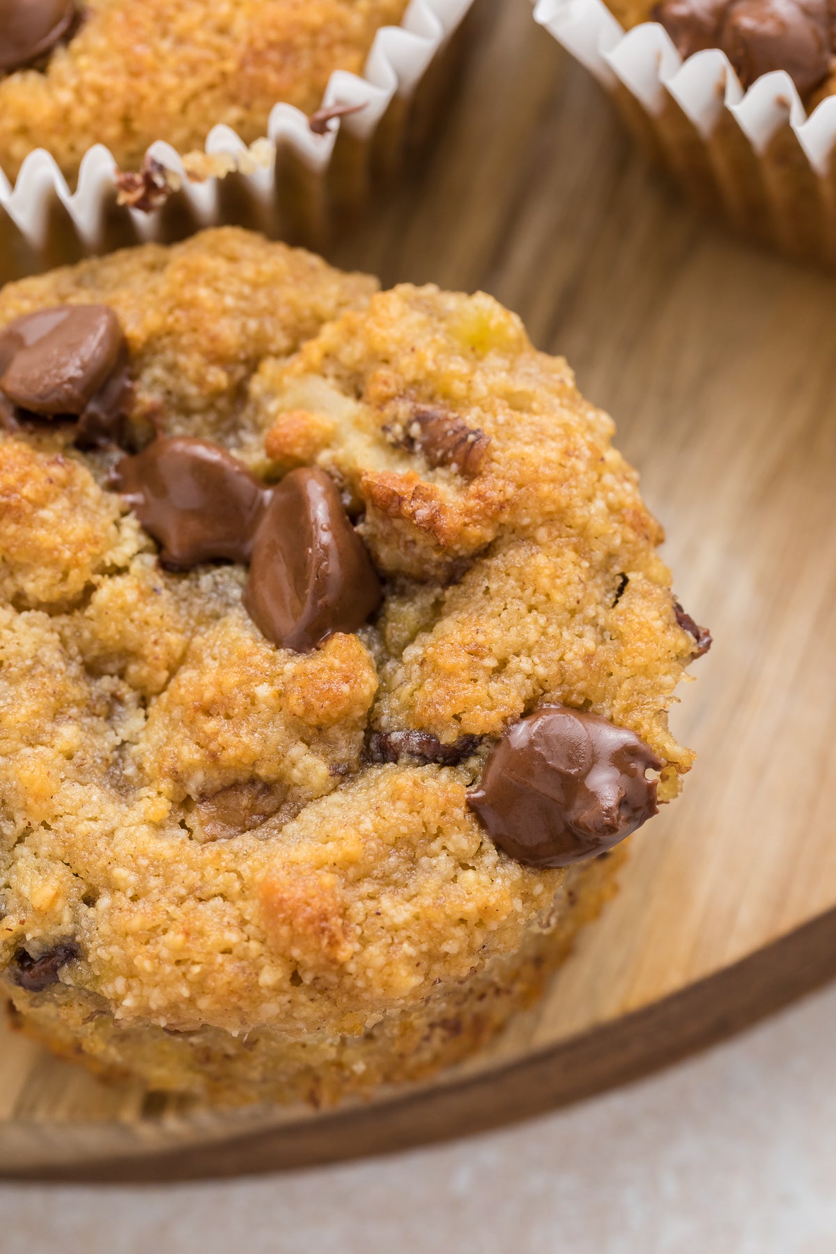Ingredients: Almond flour, baking powder, baking soda, ground cinnamon, salt, bananas, maple syrup, oil, egg, vanilla extract, walnuts, chocolate chips.