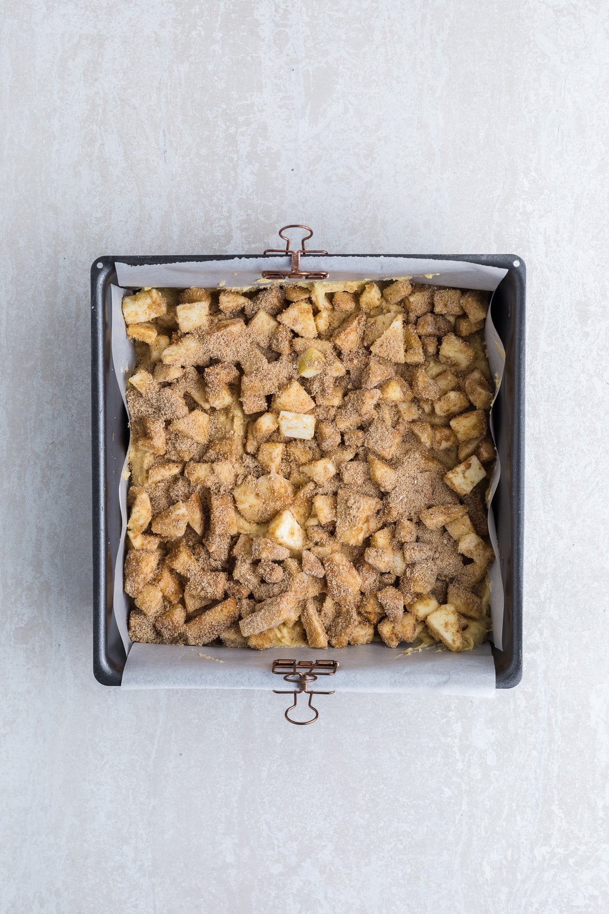 This soft buttery cake is stuffed with a layer of tender apples mixed with cinnamon, giving lightly spiced apple flavors in every bite. The cake is topped with a cinnamon streusel topping, adding a crisp texture to the top of the cake.