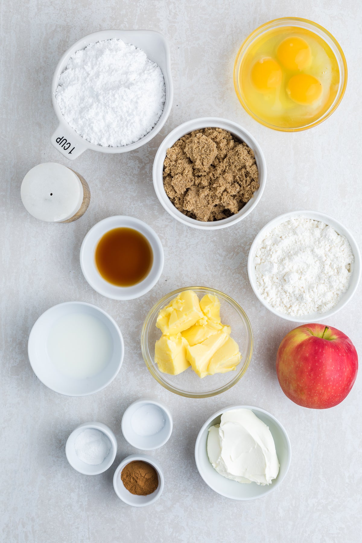 Ingredients: Flour, brown sugar, cinnamon, butter, apples, eggs, sour cream, vanilla, baking powder, baking soda, salt, powdered sugar, milk.
