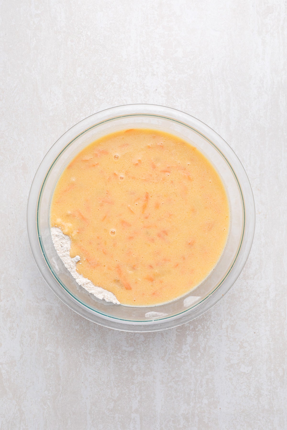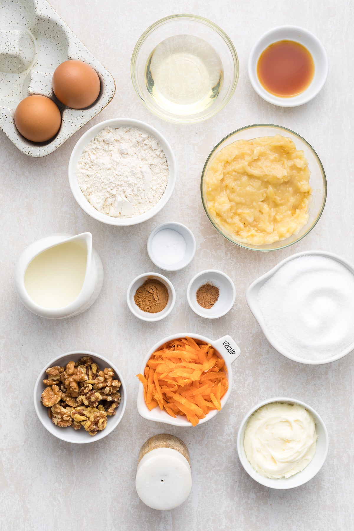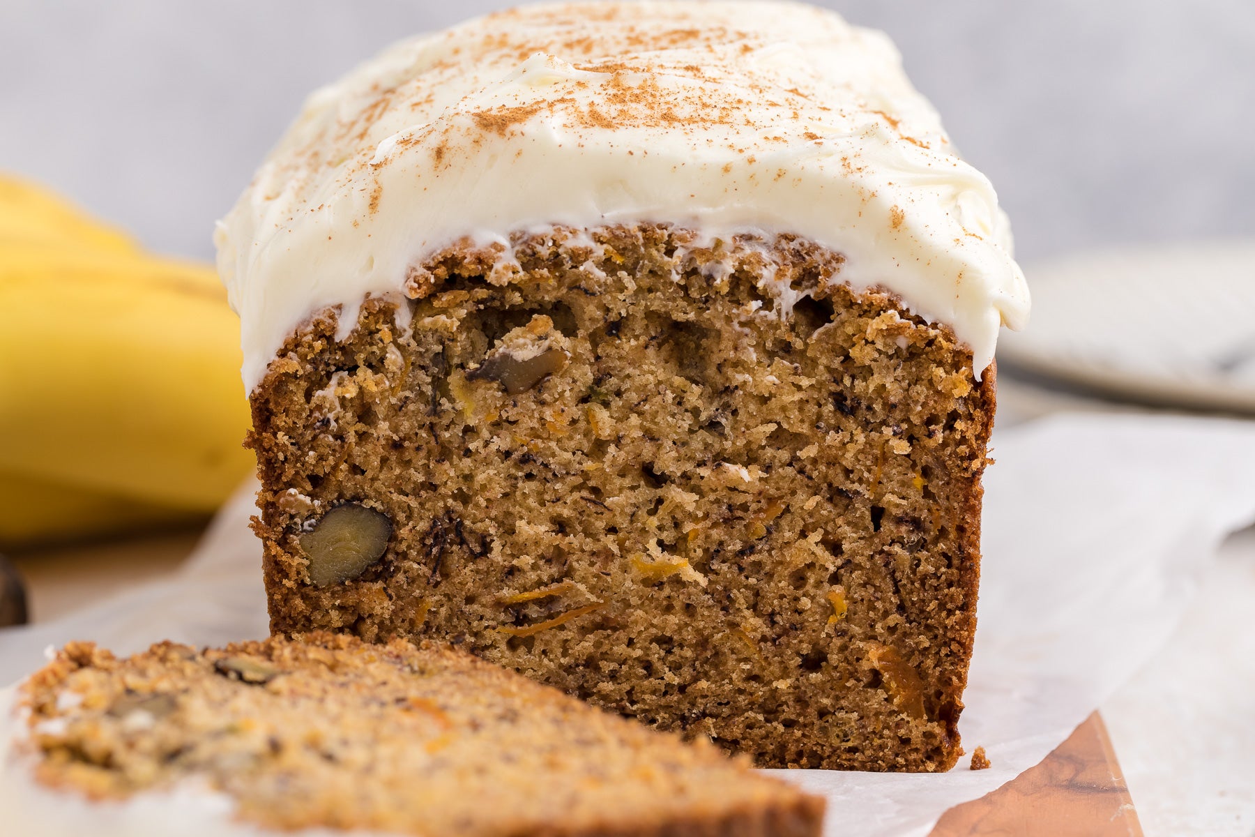 Ingredients: Flour, granulated sugar, walnuts, baking soda, ground cinnamon, salt, nutmeg, bananas, carrot, milk, oil, eggs, vanilla, cream cheese frosting.