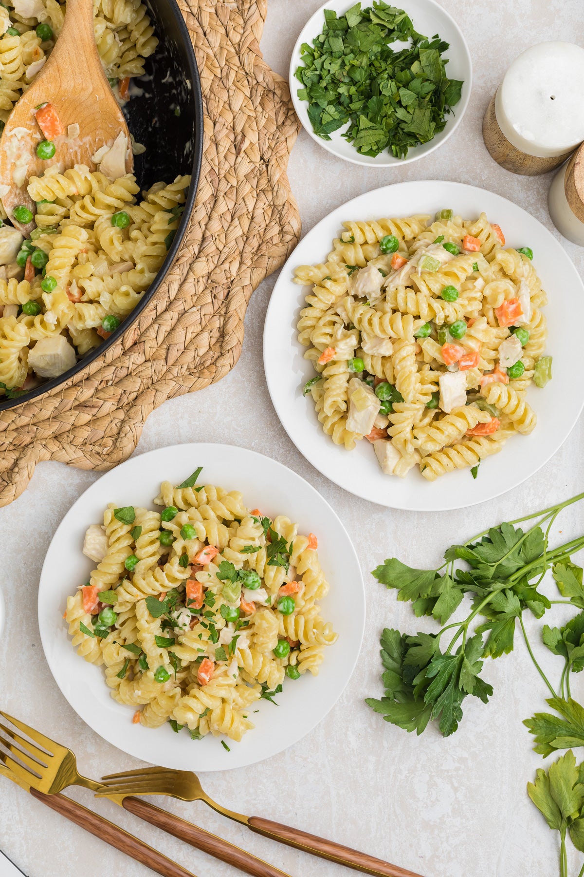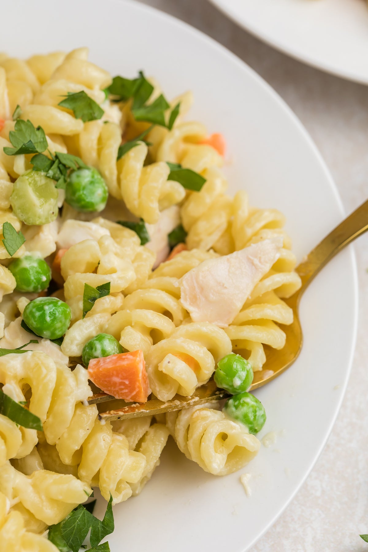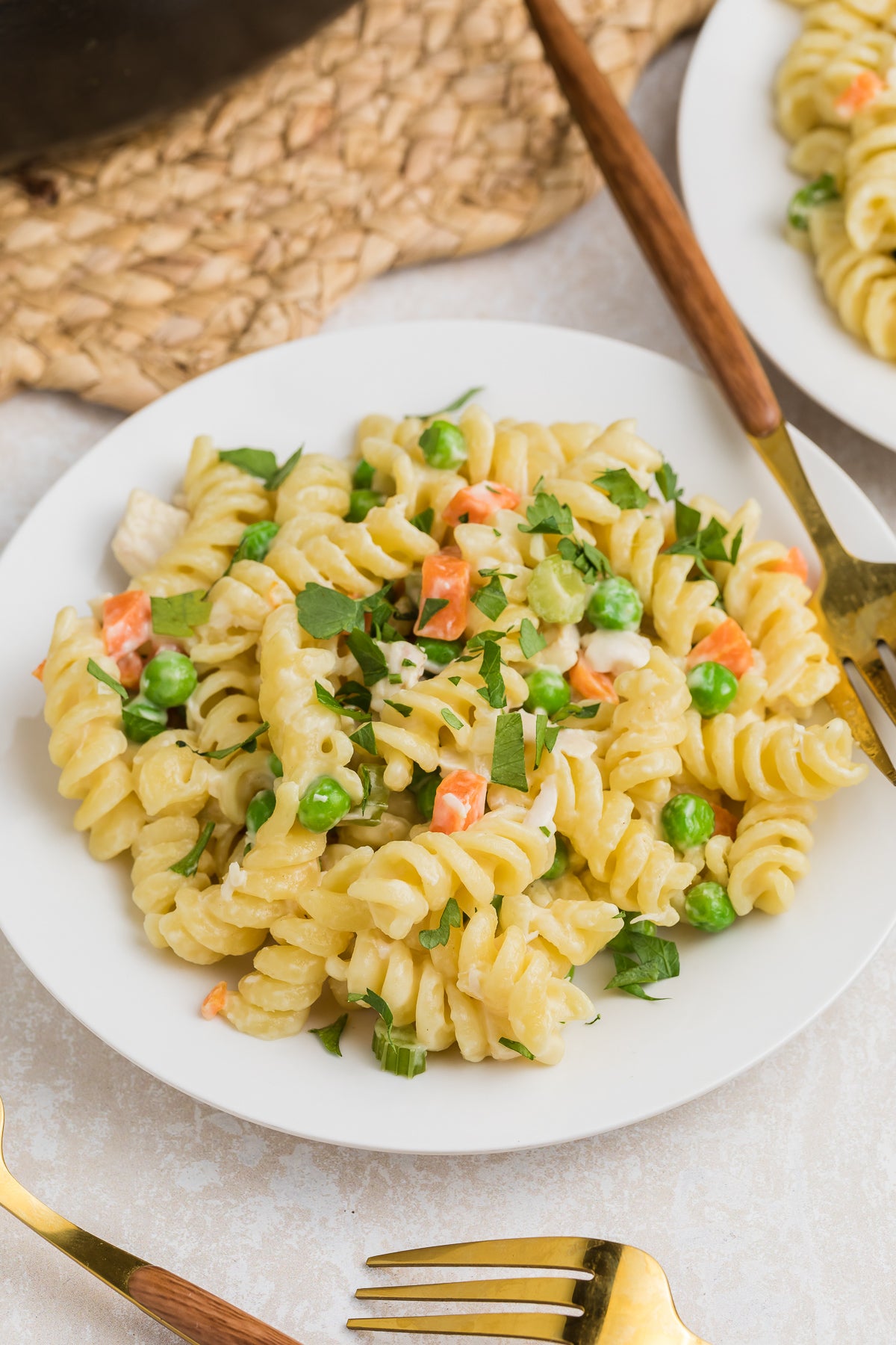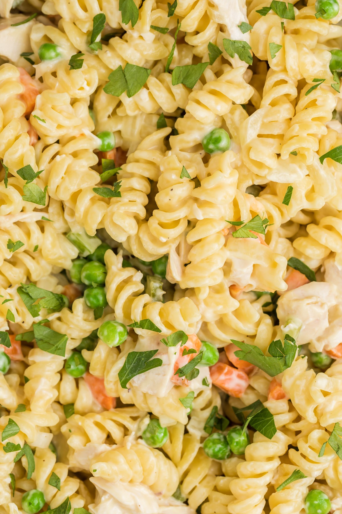 The pasta is coated in a cream and chicken broth sauce filled with onion, carrot, celery and peas, along with chunks of chicken. Rotisserie chicken is used in this recipe to cut down the time and effort required.