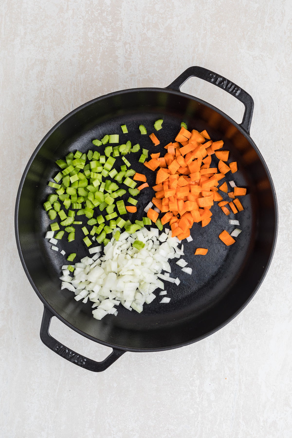 Ingredients: Oil, butter, onion, carrot, celery, garlic, flour, chicken broth, cream, cooked chicken, frozen peas, fresh parsley.