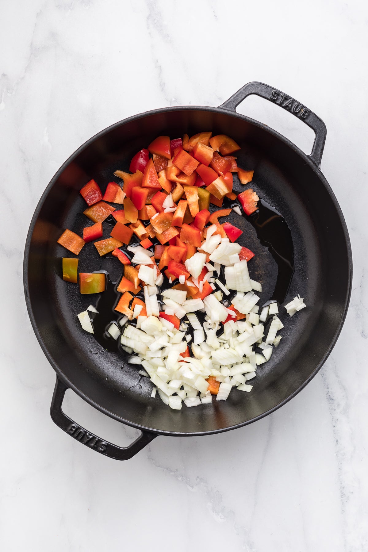 Ingredients: Oil, onion, bell pepper, garlic, diced tomatoes, cumin, paprika, ground coriander, eggs, fresh parsley.