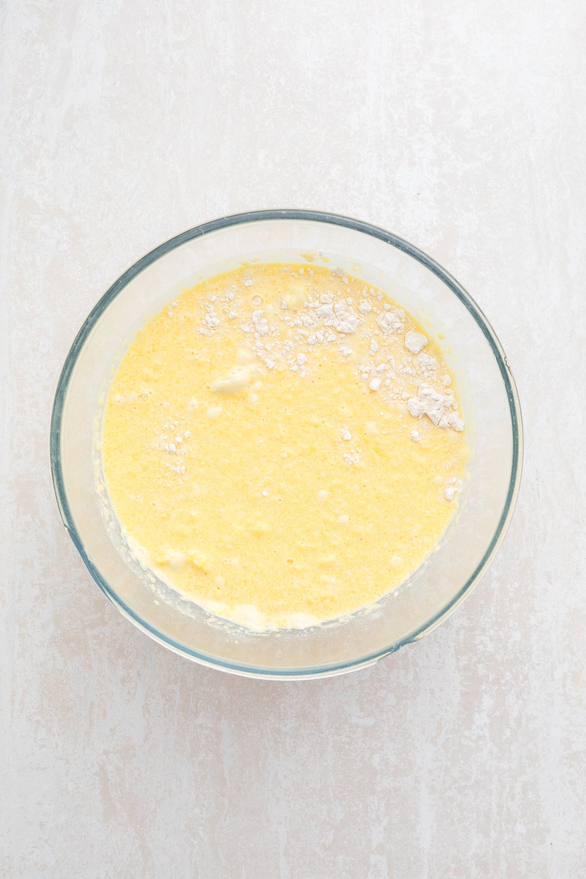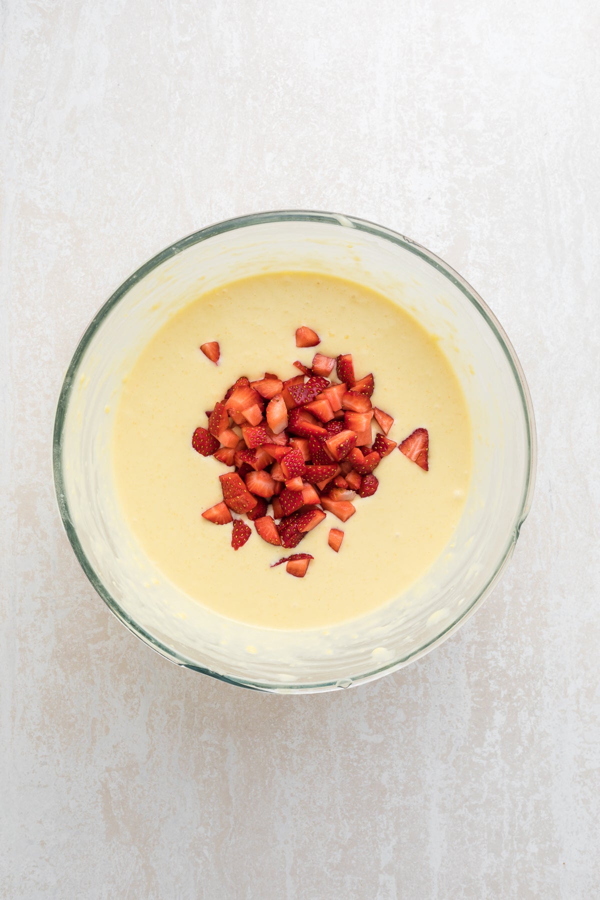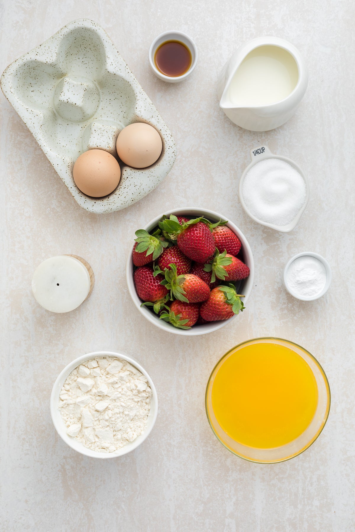 Ingredients: All-purpose flour. granulated sugar, baking powder. salt, milk, butter, eggs, vanilla, strawberries.